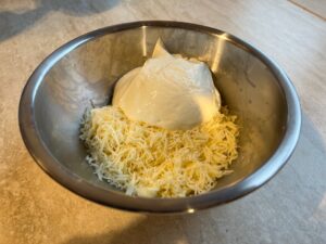 • Geriebenen Käse und saure Sahne verrühren und drüberstreichen.