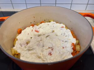 • In eine feuerfeste Form umfüllen (wenn Ihr keinen Römertopf verwendet).