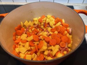 • Karotten und Kartoffeln hinzugeben und kurz andünsten.