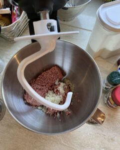 - Knete das Hack sorgfältig zusammen, füge Zwiebeln, Knoblauch und Paniermehl und ein Ei hinzu und knete die Masse. Dann folgen Milch und Salz und Pfeffer nach Geschmack.