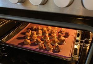 - Anschließend kommen die Fleischbällchen für eine halbe Stunde bei 160 Grad Umluft oder bei 180 Grad Ober-Unter-Hitze in den Ofen.