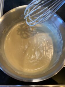 - Für die Soße die Butter in einem Topf schmelzen, dann das Mehl einrühren und zwei Minuten köcheln lassen.