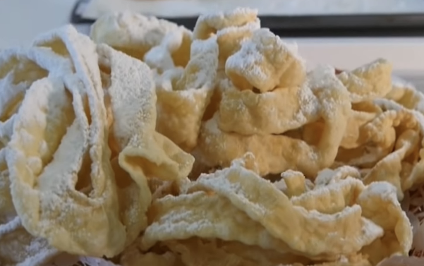 - Wenn alles geschnitten ist, nimmt man ein Quadrat und wirft es durcheinander und leg es dann in einen großen Schöpflöffel und gibt es ins heiße Fett (oder Dose, die im Fettbad schwimmt). Einmal drehen, dass beide Seiten gebacken werden.