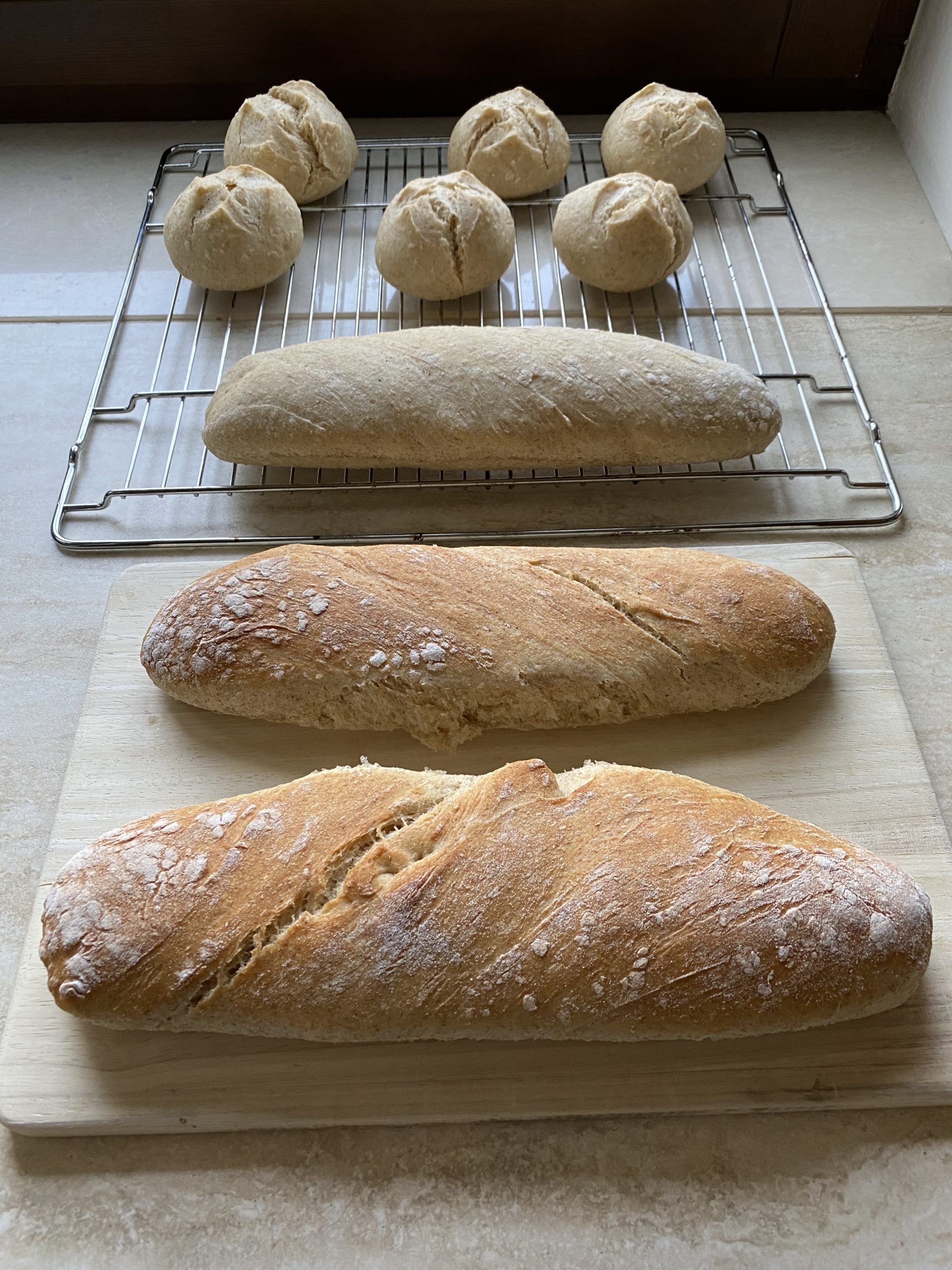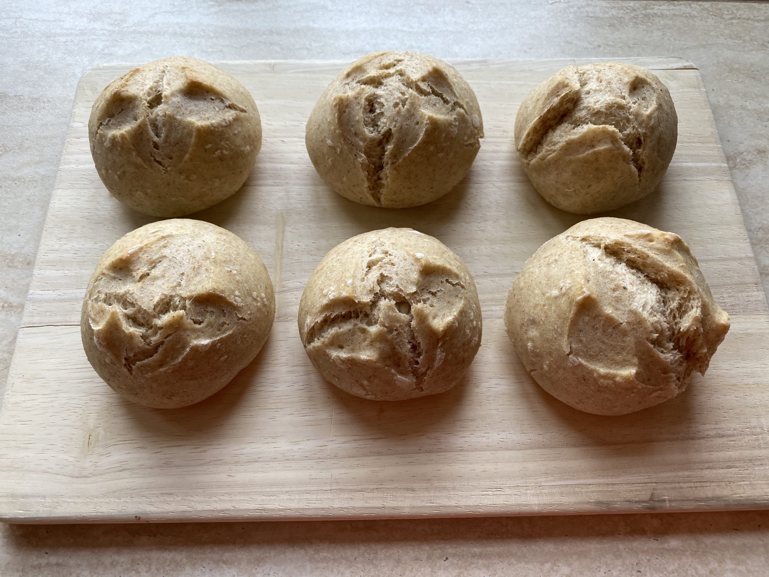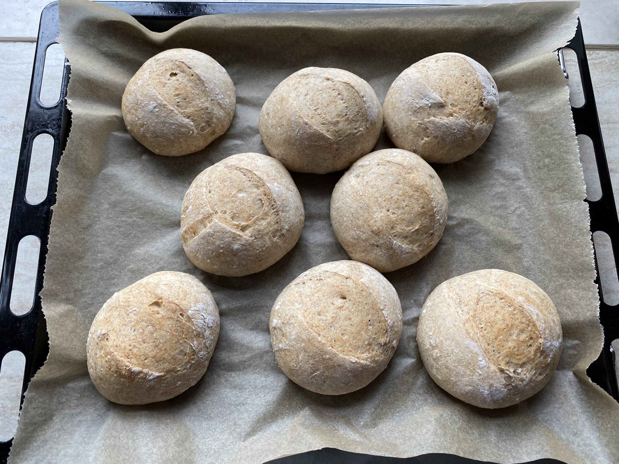 Die Teiglinge im vorgeheizten Ofen ca. 13-15 Minuten vorbacken. Diese dürfen noch keine Backfarbe bekommen, es reicht wenn die Teiglinge aufgegangen und stabil sind (siehe Fotos).Tipp: Stelle einen Topf mit Wasser in den unteren Bereich des Ofens!